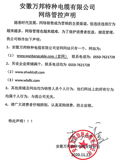 鄭重聲明:安徽萬邦特種電纜有限公司官方網站為:www_wanbangcable_com.jiashitv.com,除此之外無任何子網站或合作網站,其余均為假冒偽劣。電話:0550-7621728 13485756353 地 址:安徽省天長市滁州高新技術產業開發區經四路29號
